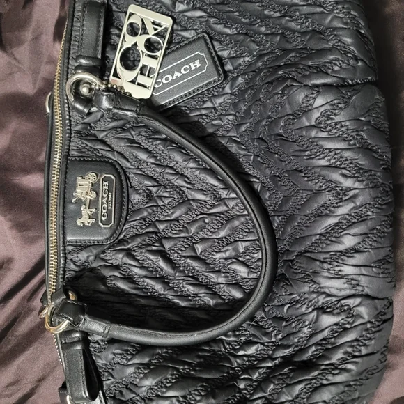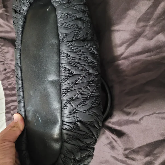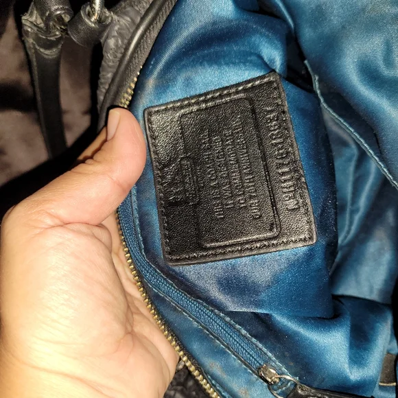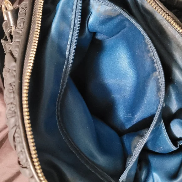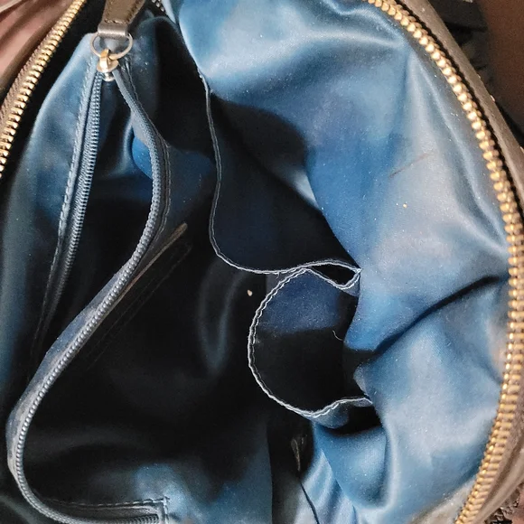 comes with dust bag, no rip or tears only a little dust in some areas insidesee all photos as they are part of description. used it a handful of times. it was stored or a long time and now have no use for it. beautiful soft leather. honestly,photos don't do it justice. it's a deep rich black color and the bottom isn't noticeable only due to the flash.